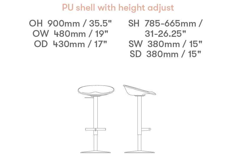 JoJo is an elegant and curvaceous stool created from 3D veneered Plywood or PU to provide one of the most comfortable shapes. JoJo’s two frame styles complement the seat design in the form of high and low four leg frames, or a height adjustable frame with a swiveling center pedestal.
